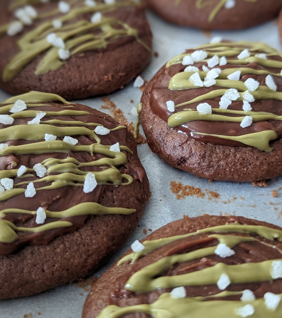- Decorate with thin strips of pistachio spread and sugar crystals.