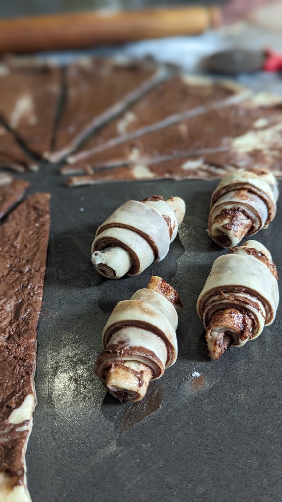 - Spread the dough with Nutella.