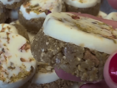 - Sprinkle dried rose petals and crushed pistachios in a silicone mold.