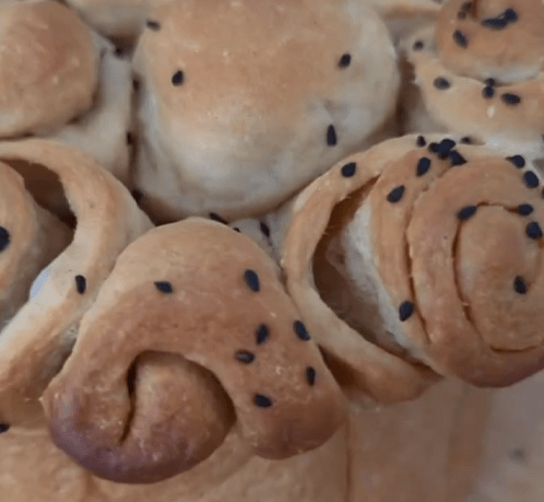 - Roll out one dough ball into a rectangle, stretch the edges, and spread a thin layer of softened butter. Roll into a log, cut in half, and place in the pot. Sprinkle with Nigella seeds