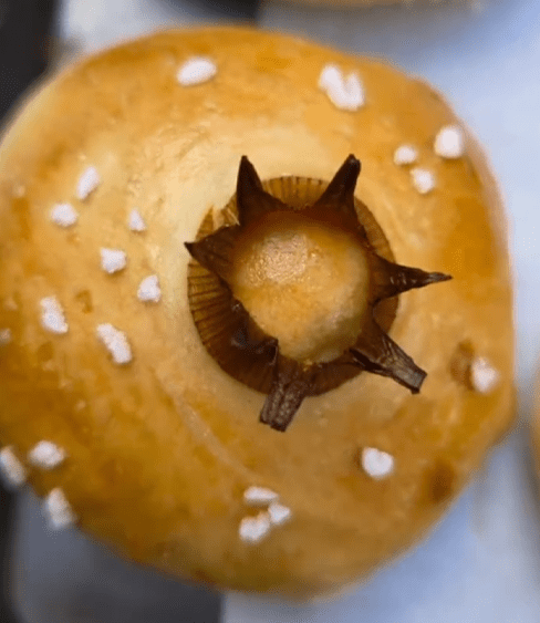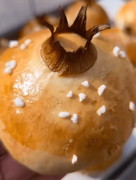 - Gently place a leek crown on every bun and sprinkle with granulated sugar