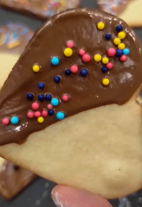 - Dip half of each cookie in the melted chocolate of choice and transfer into the baking tray baking paper