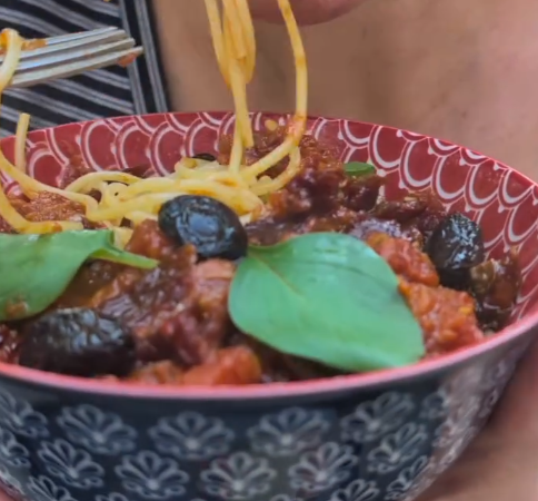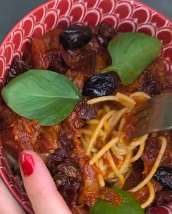Tomato, black olive, garlic… there’s something so comforting about eating spaghetti with this rich tomato sauce!