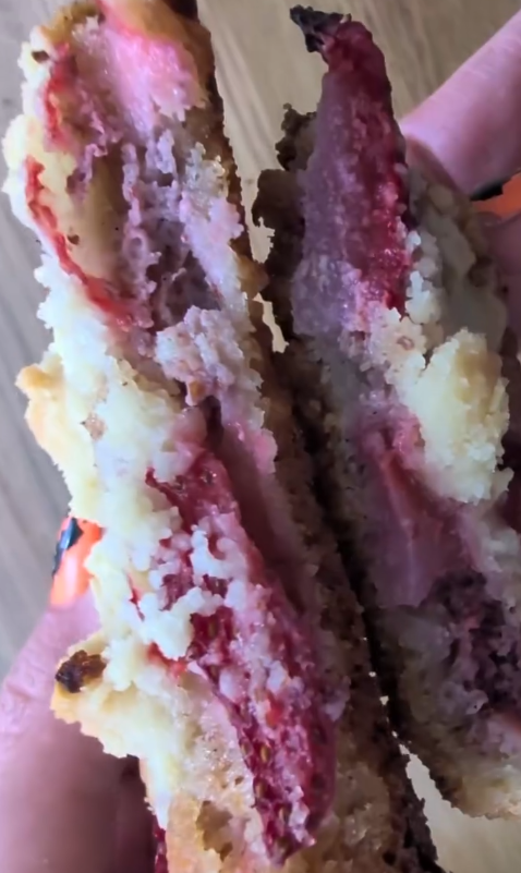 - Spread almond cream, add sliced strawberries, and cover with crumbs. Bake for 8-10 more minutes, until golden.