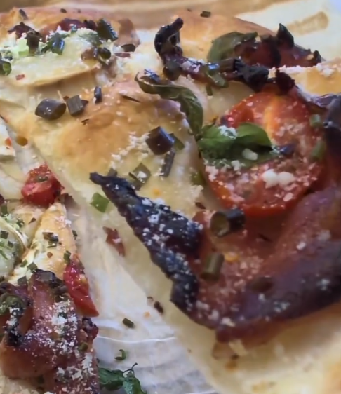 - Unfold the sheet, and top with goat cheese, bacon, then arrange tomatoes, basil, and chives