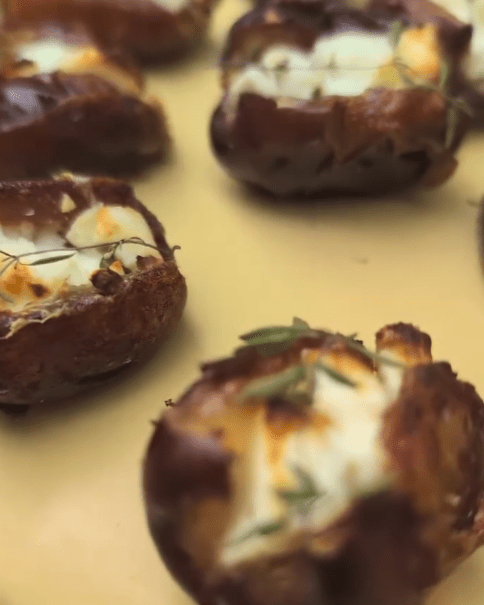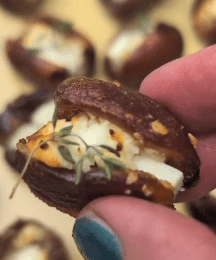 - Pit the dates and stuff each with a cube of feta and a tiny sprig of thyme
