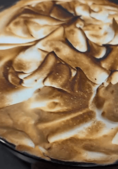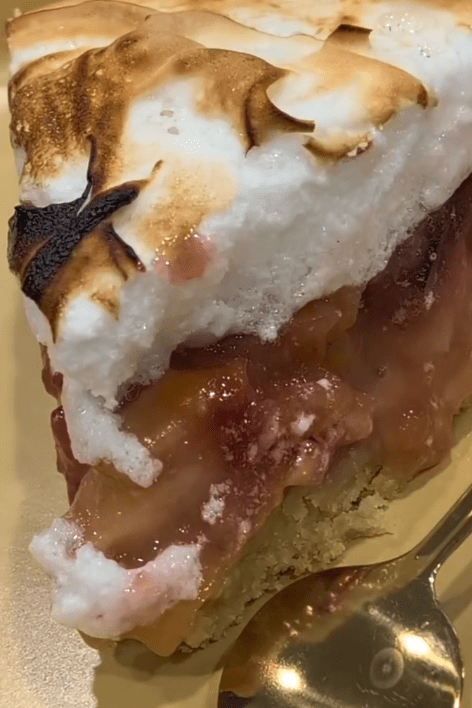 - Spread meringue over the fruit layer and bake for 7-10 minutes until lightly golden. Let cool before slicing
