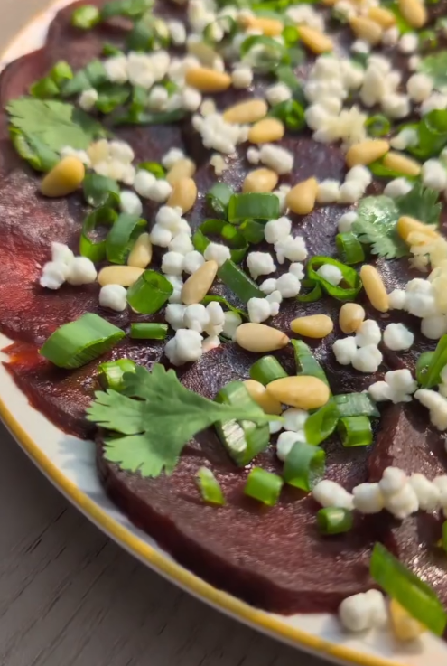 - Sprinkle with nuts, herbs, pomegranate, and flaky salt