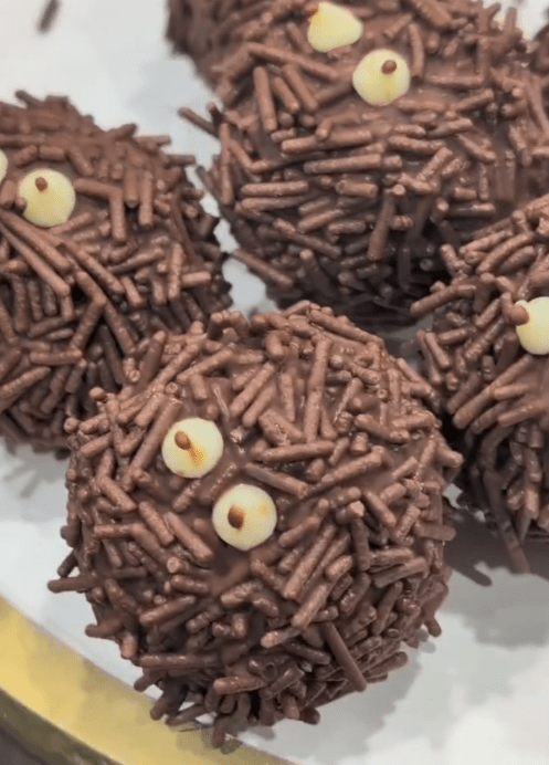 - Mel the chocolate in the microwave. Dip the balls in chocolate, coat with sprinkles, and add two eyes
